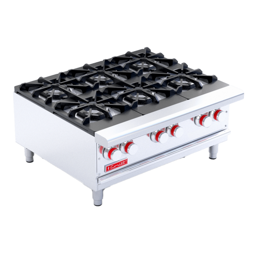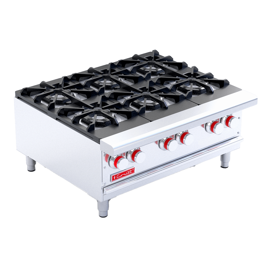 6 Quemadores abiertos octagonales con tapa desmontable en hierro fundido de 29,000 Btu/h c/u.