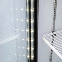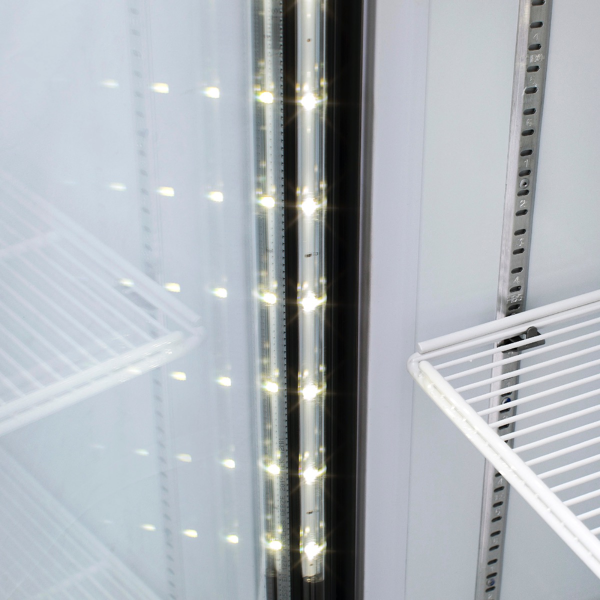 La puerta del refrigerador incluye doble cristal con gas argón y una capa Low-e que reduce la transferencia de calor. Esta tecnología evita la condensación y mejora la eficiencia energética, asegurando un bajo consumo eléctrico y un alto rendimiento.