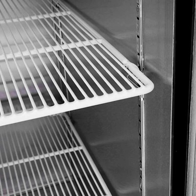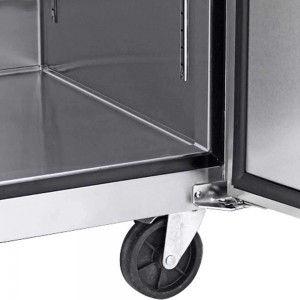 Las dos puertas solidas del congelador cuentan con cerraduras estandar para garantizar la seguridad de los productos almacenados. Ademas, presentan manijas empotradas que ahorran espacio y facilitan la apertura y cierre de las puertas. Estas puertas tambien tienen funciones de autocierre y mantener puerta abierta para una mayor comodidad durante la carga y descarga de productos.