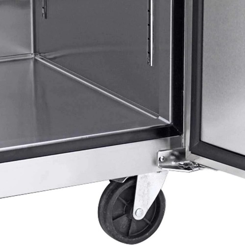 La movilidad es esencial en un entorno comercial. Este congelador cuenta con dos ruedas delanteras con freno y dos ruedas traseras locas que facilitan su desplazamiento y posicionamiento en el lugar deseado.