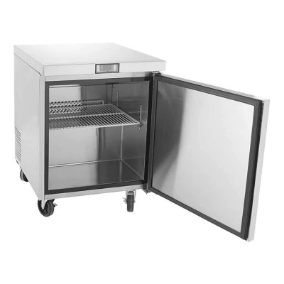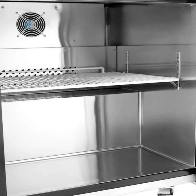El interior de esta mesa de congelacion cuenta con curvas sanitarias NSF, lo que facilita la limpieza y garantiza un ambiente higienico para tus alimentos congelados. Esto es esencial en entornos comerciales donde la limpieza y la seguridad son prioridades.
