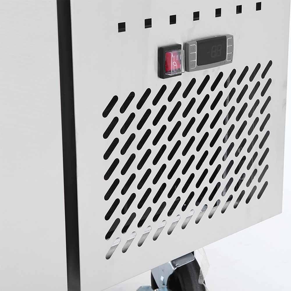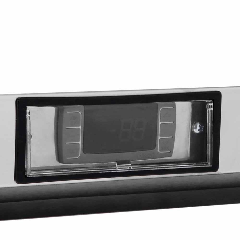 Esta base de chef refrigerada mantiene una temperatura constante en el rango de 0.5 a 3.3 Grados C, ideal para preservar la frescura de tus ingredientes.