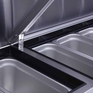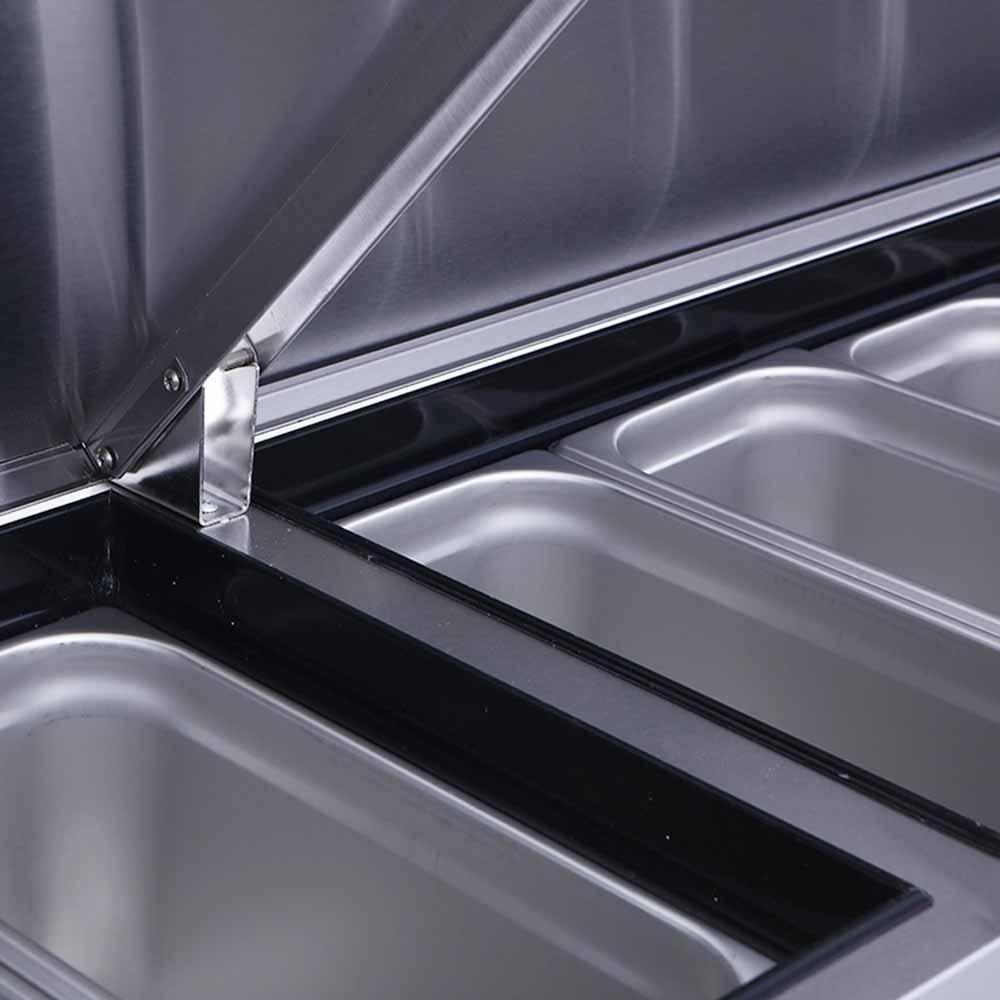 La mesa incluye un nicho con tapa disenado para contener hasta 6 bandejas de acero inoxidable GN de 1/3, que ya vienen incluidas. Esto te permite mantener tus ingredientes frescos y organizados de manera eficiente.