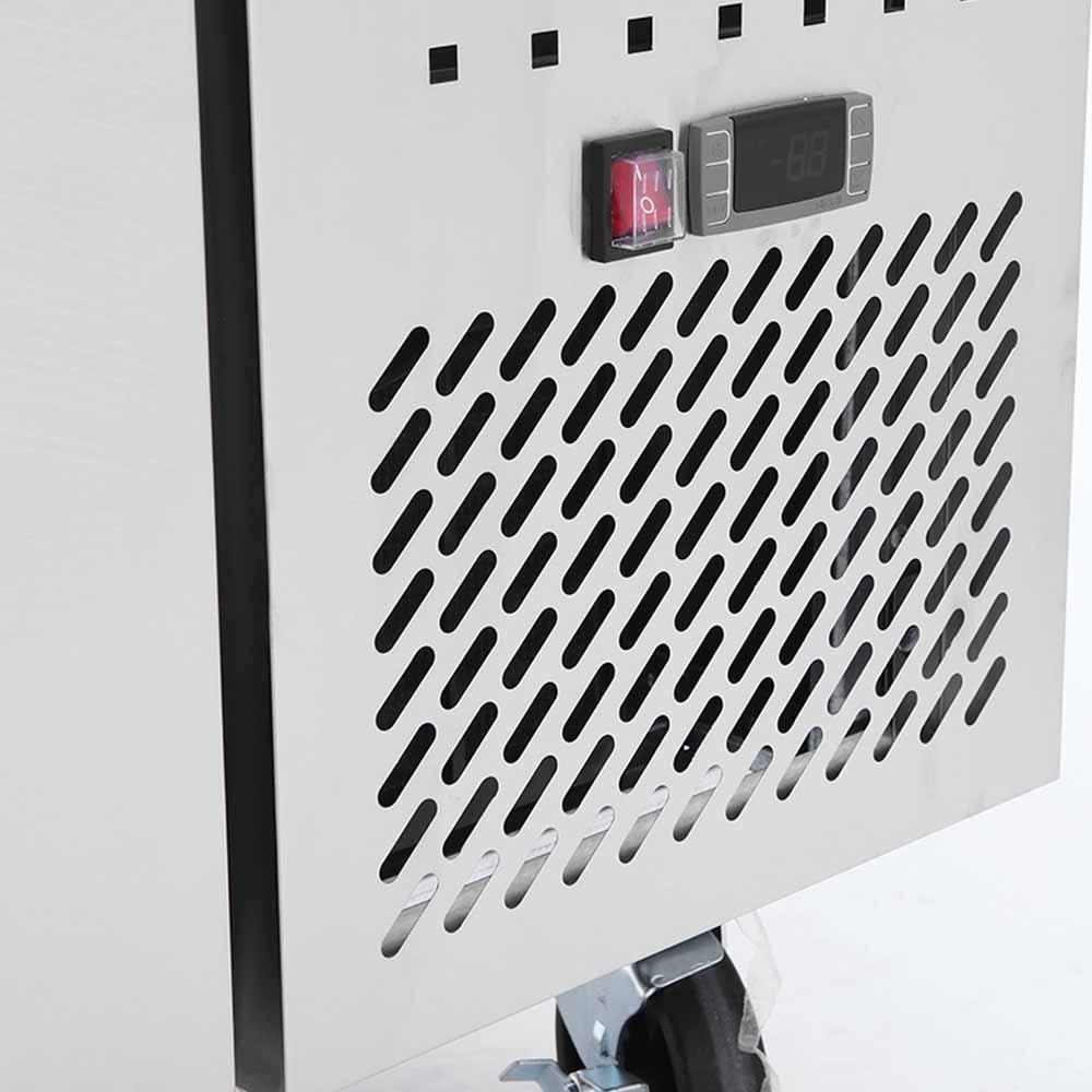 Esta mesa de preparacion mantiene una temperatura constante en el rango de 0.5 a 3.3 Grados C, lo que es ideal para preservar la frescura de tus ingredientes.