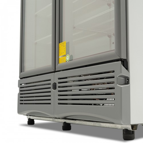Las dos puertas cuentan con doble cristal, gas argón y una capa Low-e que reduce la pérdida de temperatura, evita la formación de condensación y mejora la conservación de los productos. Este diseño asegura un menor consumo de energía y una mejor experiencia para los usuarios.